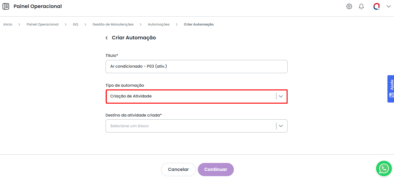 Logo abaixo, você deve informar o Tipo de Automação desejado, que neste caso é Criação de Atividade.