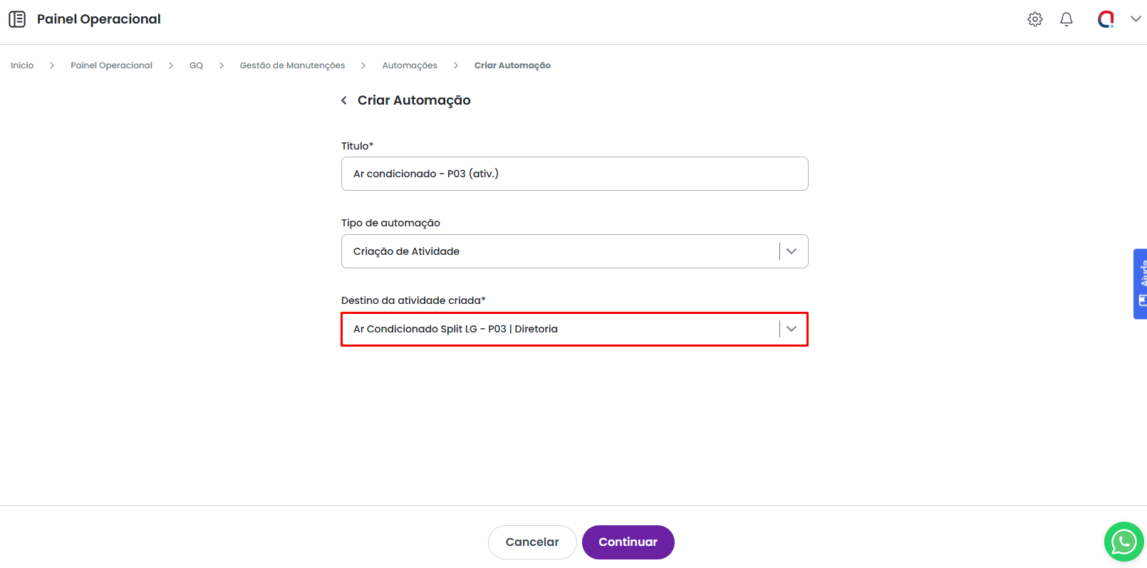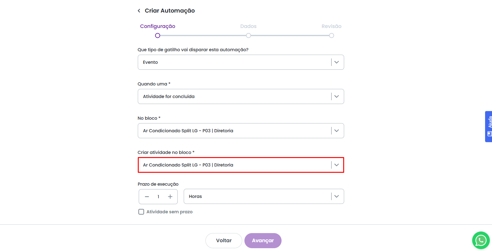 Nesta etapa, você terá a possibilidade de realizar o pré-preenchimento de um campo. Dessa forma, quando a atividade for criada pela automação, o campo já terá a informação definida, facilitando a inclusão de atividades recorrentes.