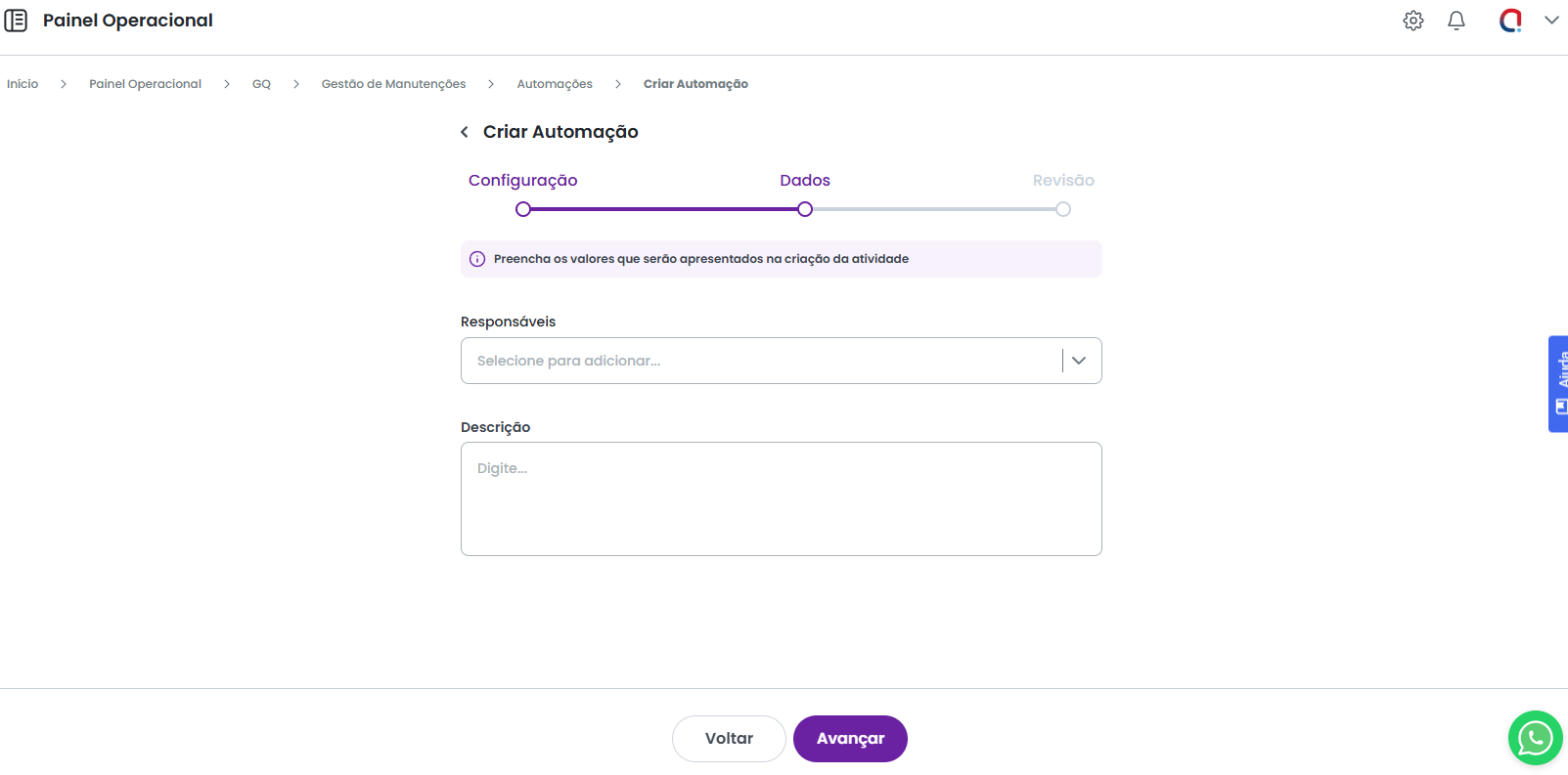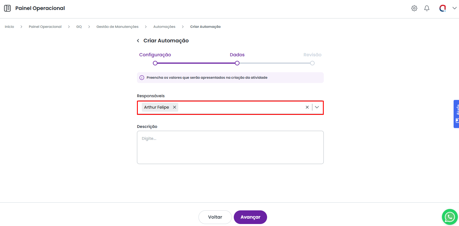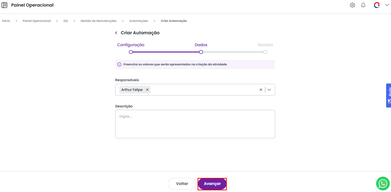Após definir os responsáveis, utilize a opção Avançar para revisar as configurações da automação.