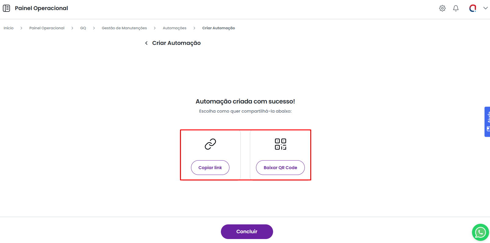 Dessa forma, a automação será criada com sucesso. Na próxima tela, serão apresentados o Link de acesso e o QR Code gerados para a automação.