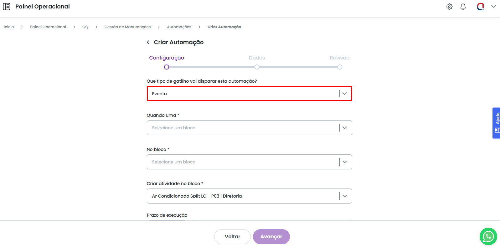 Na próxima etapa, você deve definir o gatilho que será usado para a criação da atividade. Neste caso, selecione o Gatilho por Evento.