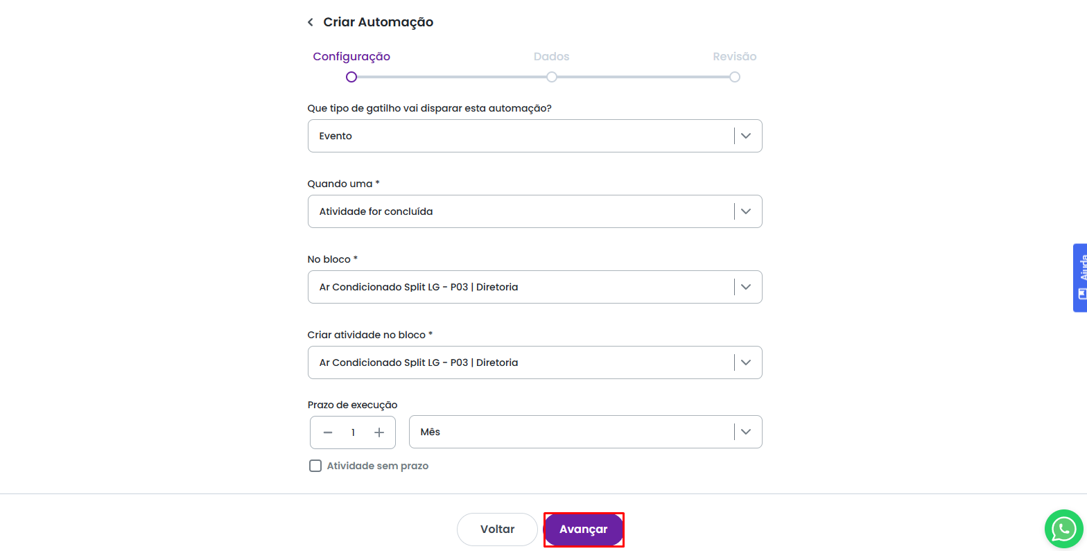 Feito as configurações, utilize a opção para avançar parra a ultima etapa de criação da automação.