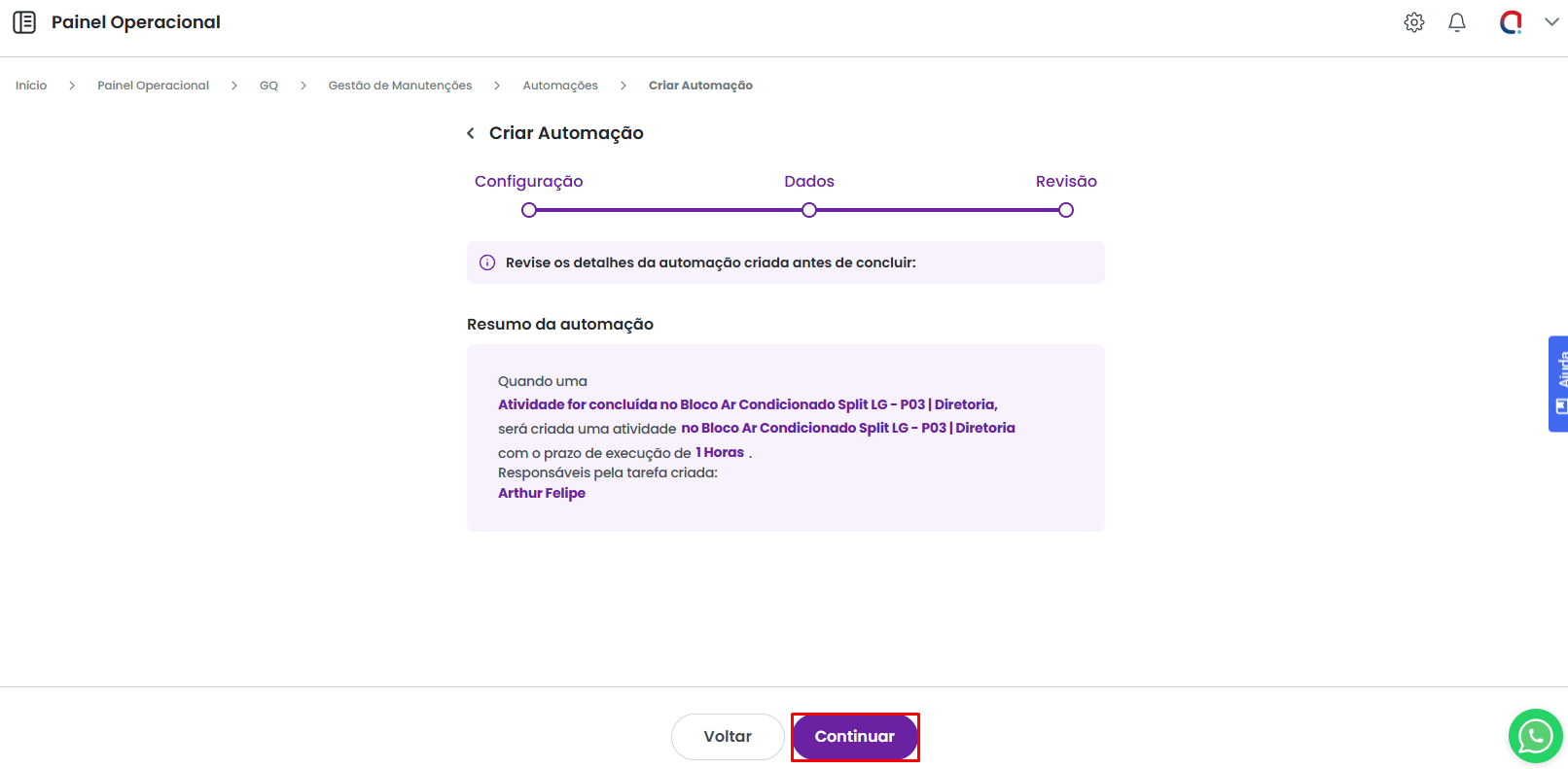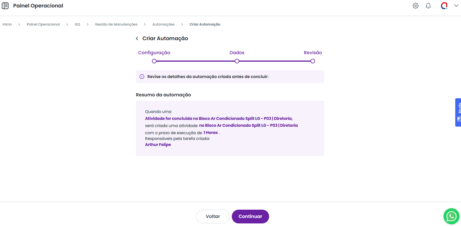 Caso seja necessário, você pode utilizar a opção Voltar para revisar e validar qualquer informação nas etapas anteriores. Estando tudo correto, utilize a opção Continuar para finalizar a criação da automação.