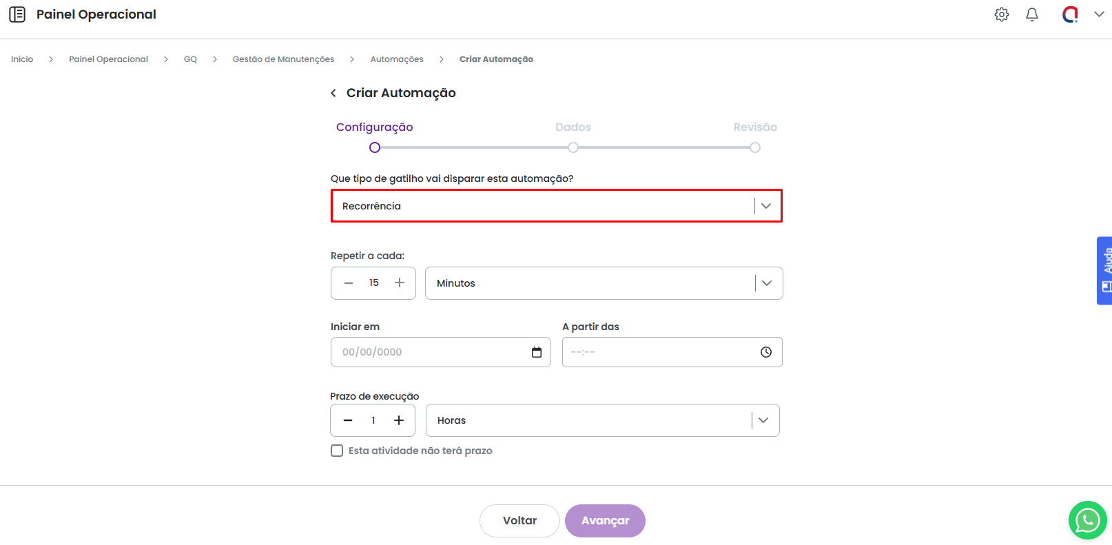 Na próxima etapa, você deve definir o gatilho que será usado para a criação da atividade. Neste caso, selecione o Gatilho por Recorrência.