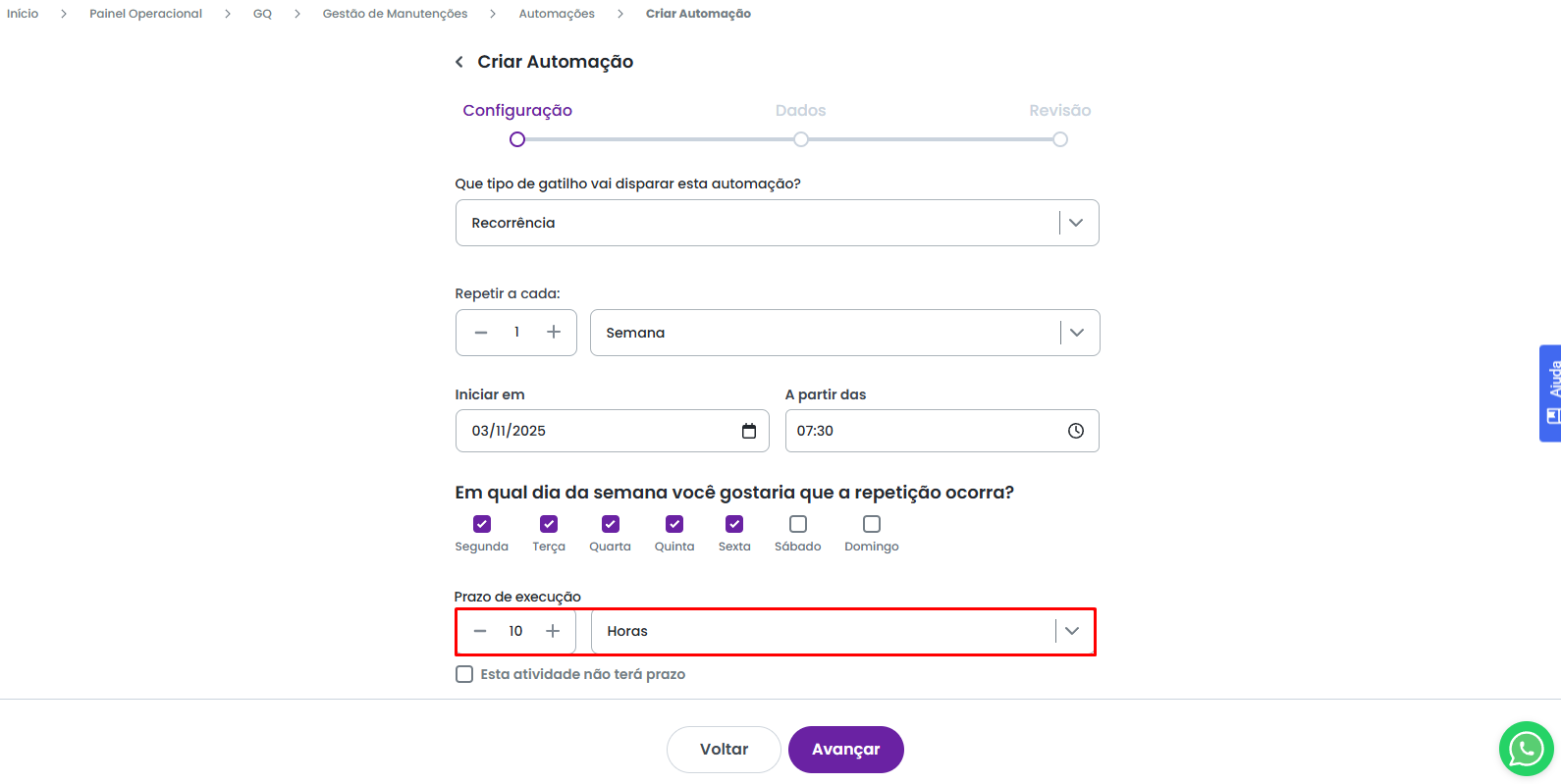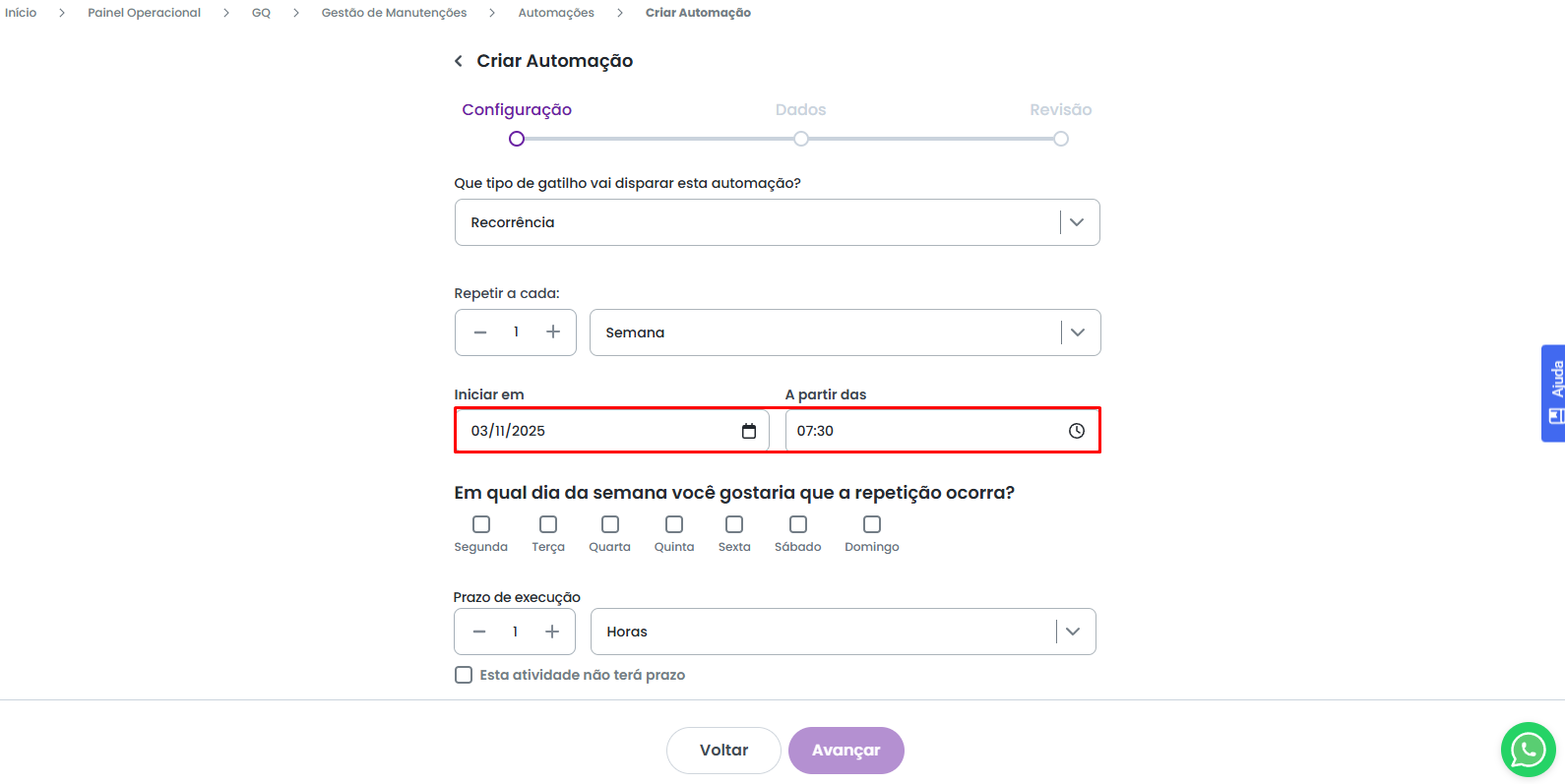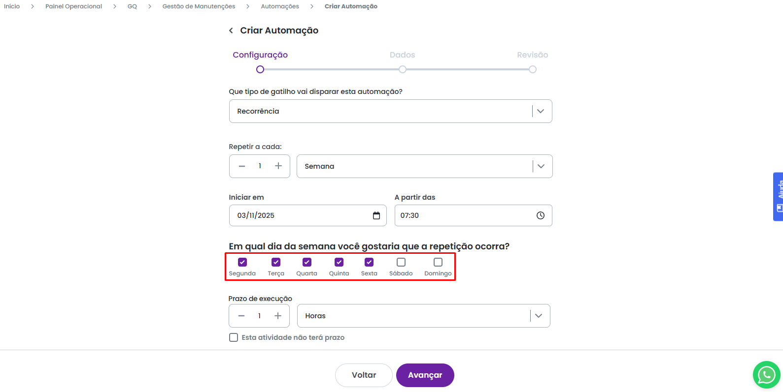 Caso você tenha optado pela recorrência Semanal, é possível definir em quais dias específicos da semana a automação deverá ser acionada.