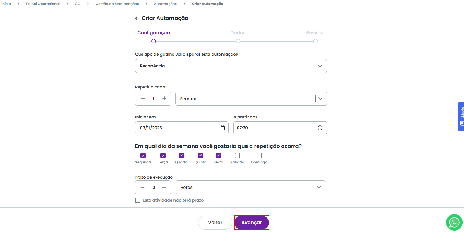 Feito as configurações, utilize a opção para avançar parra a ultima etapa de criação da automação.