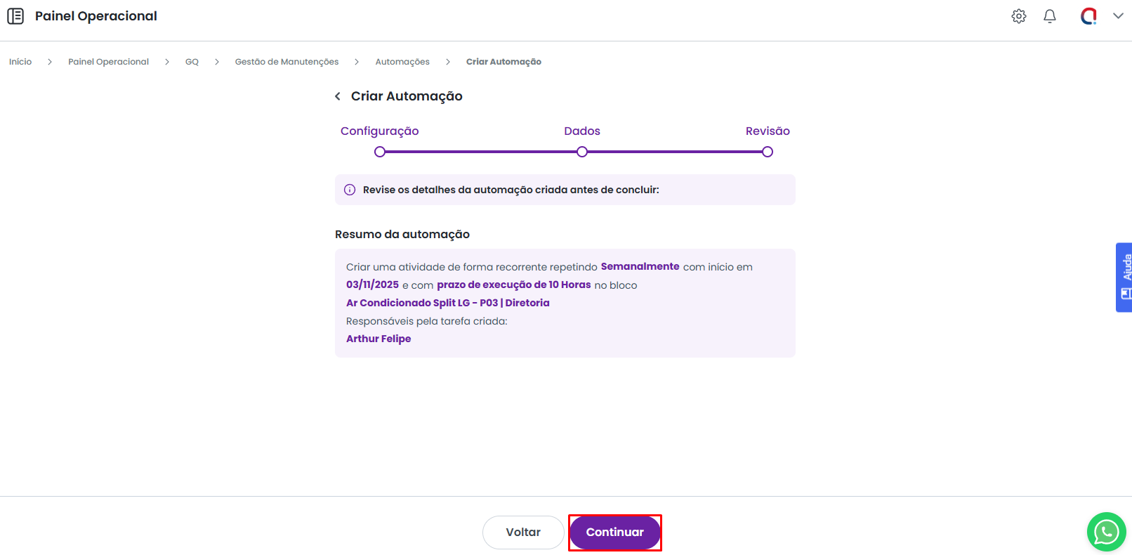 Caso seja necessário, você pode utilizar a opção Voltar para revisar e validar qualquer informação nas etapas anteriores. Estando tudo correto, utilize a opção Continuar para finalizar a criação da automação.