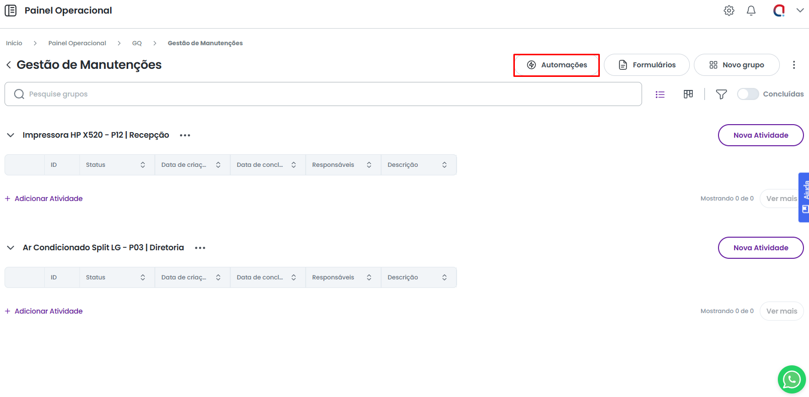 Utilizando a opção Automações, o usuário terá acesso a tela de gestão de automações.