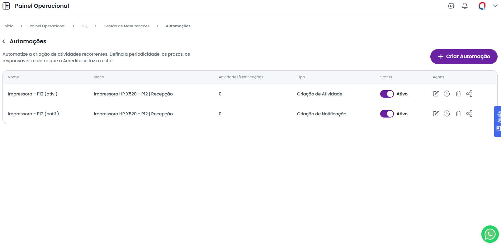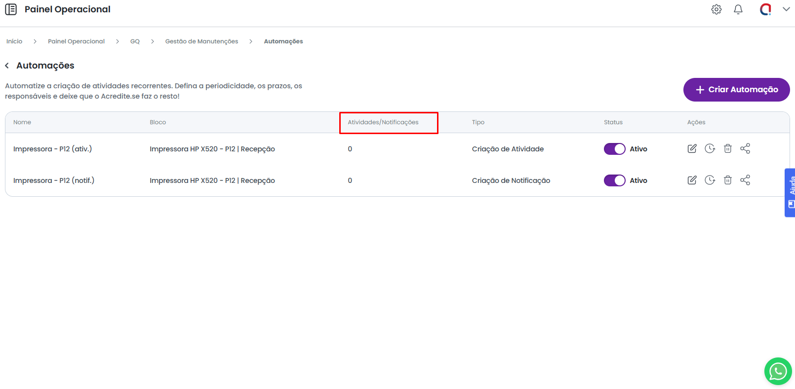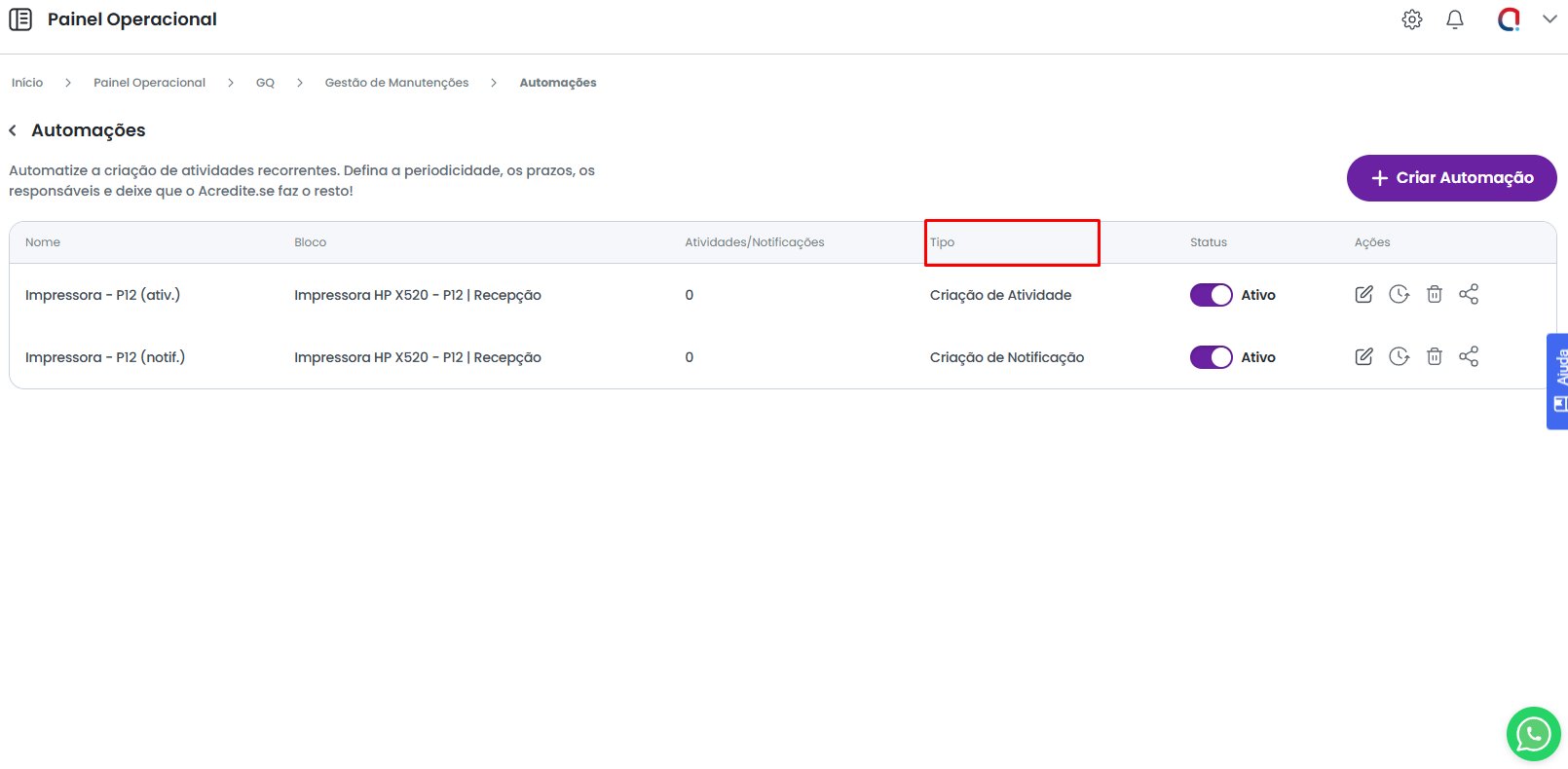 Também é possível verificar o Tipo da Automação, identificando se ela é de Criação de Atividade e/ou Criação de Notificação.