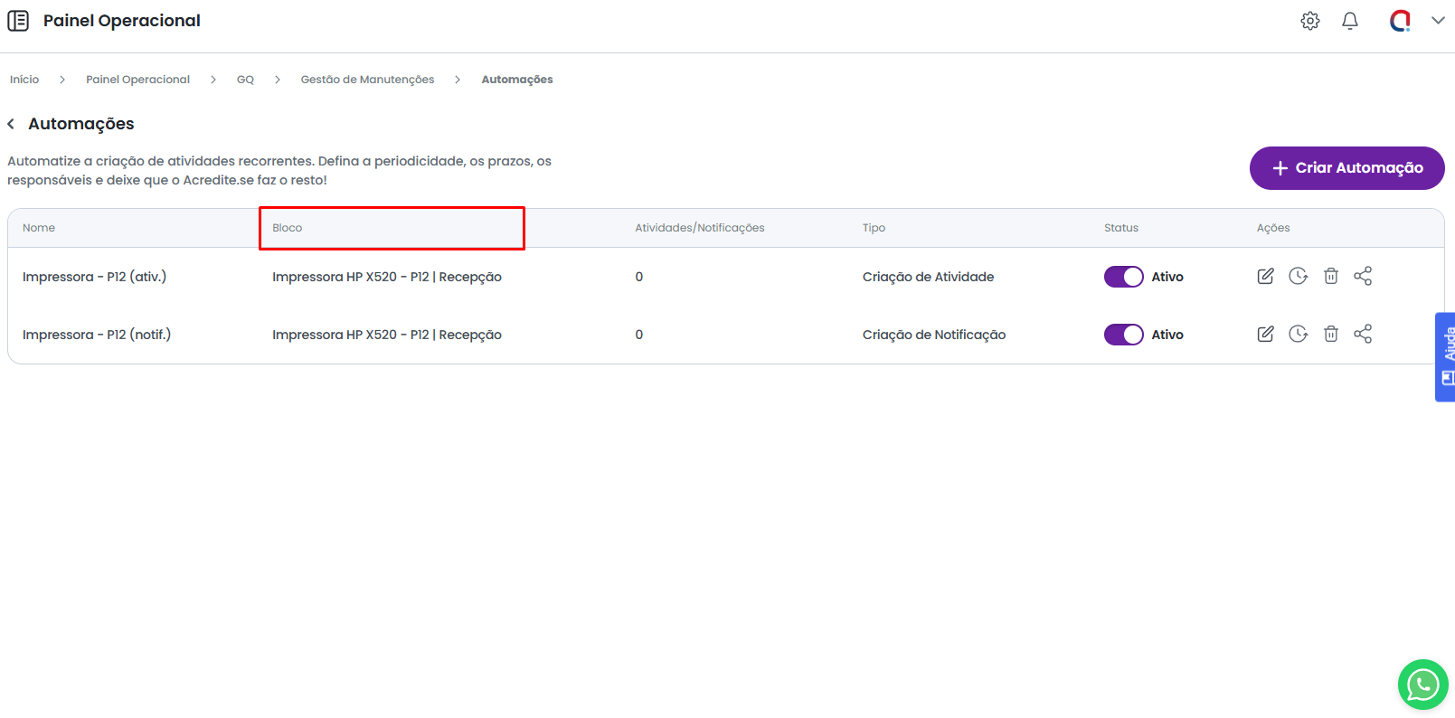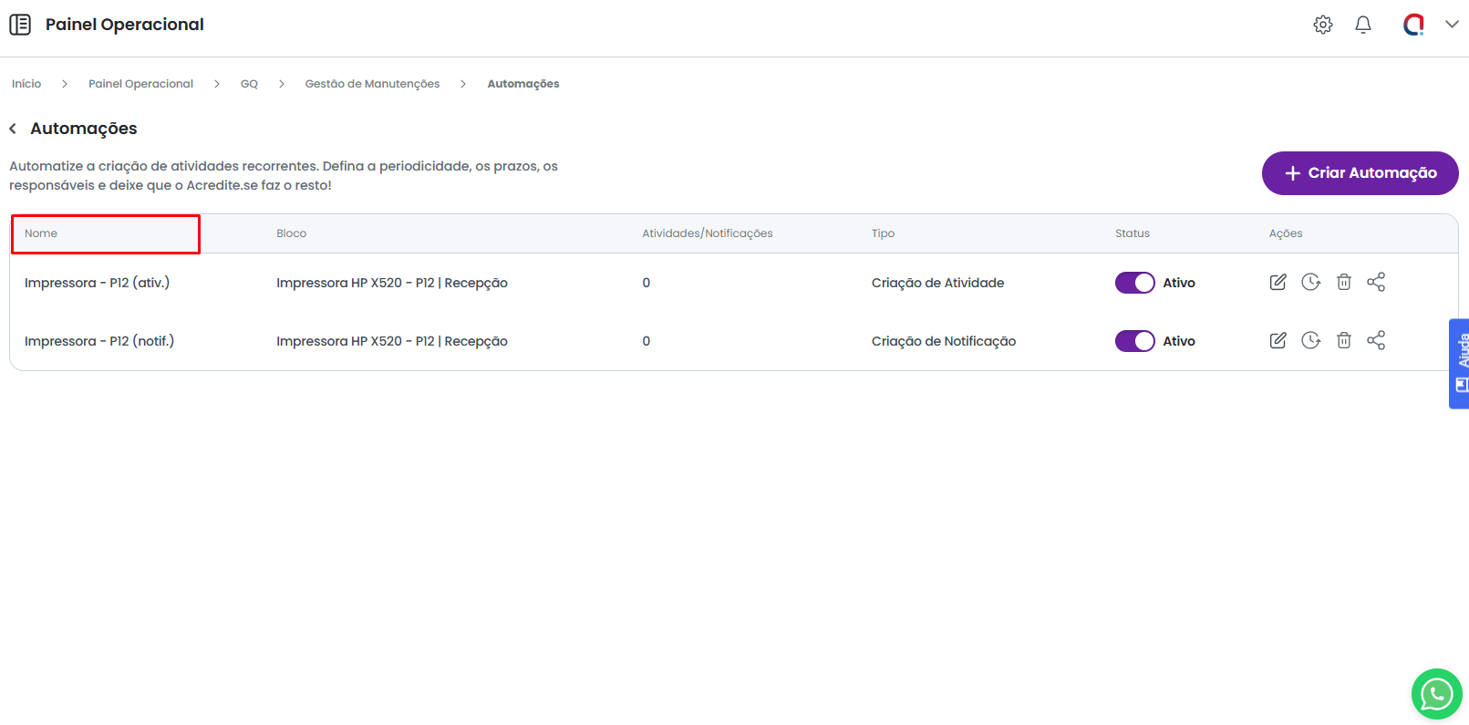A primeira coluna exibirá o nome da automação, facilitando a identificação rápida de cada registro.