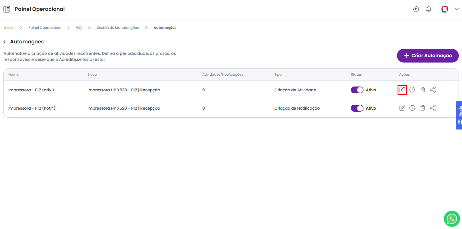A opção Editar permite alterar as configurações definidas durante a criação da automação. Para automações de criação de atividade, a edição não altera o QR Code ou o Link gerados.