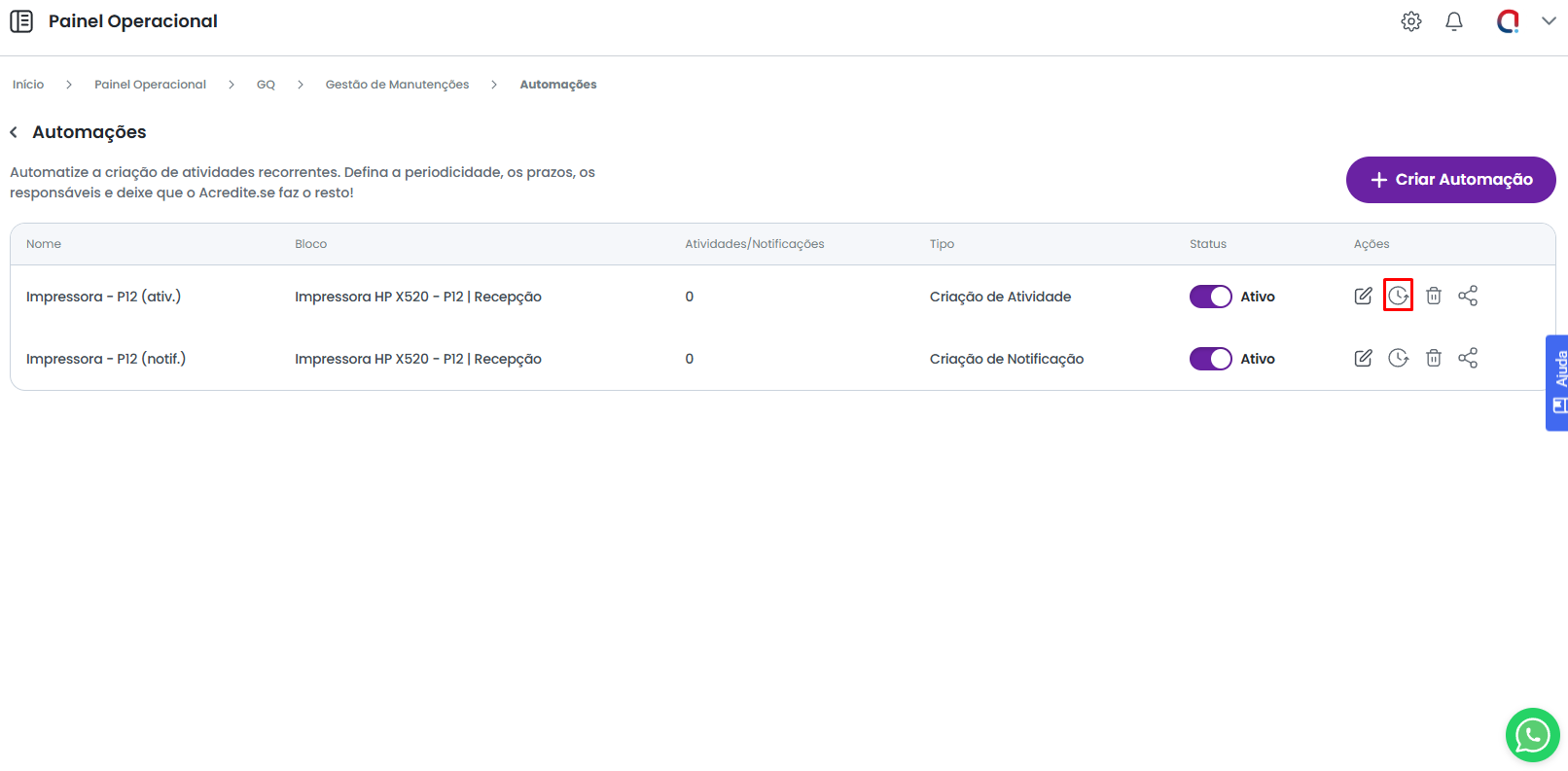 O Histórico permite ao usuário verificar as alterações realizadas na automação, exibindo a data e o responsável por cada ação.