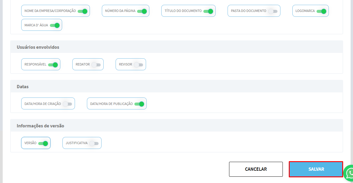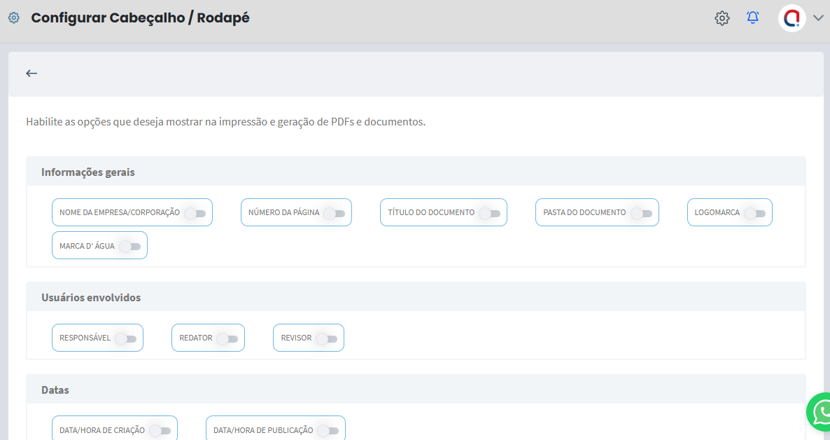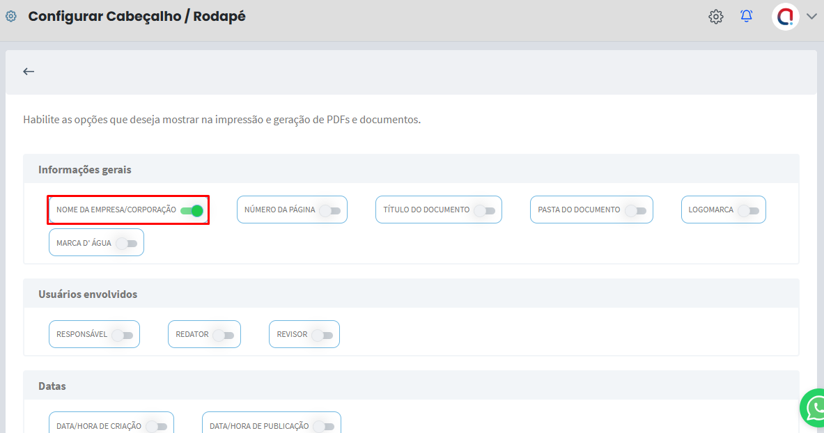 Nesta tela, podemos selecionar quais informações devem constar no cabeçalho e rodapé na impressão dos documentos, como o nome da empresa, usuários envolvidos, datas e informações de versões.