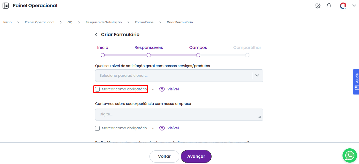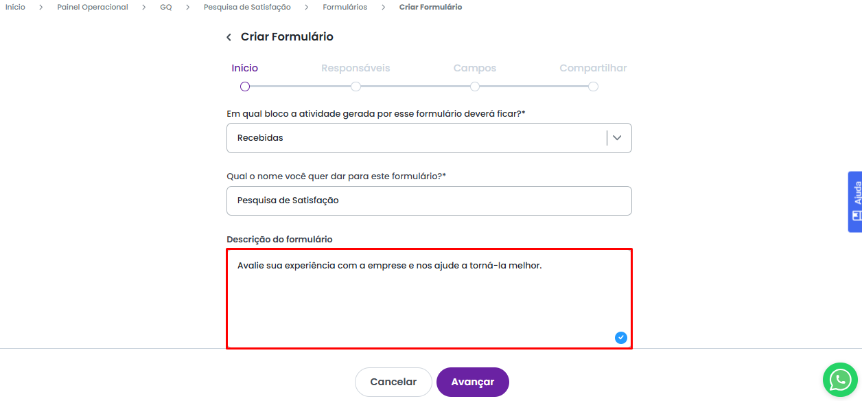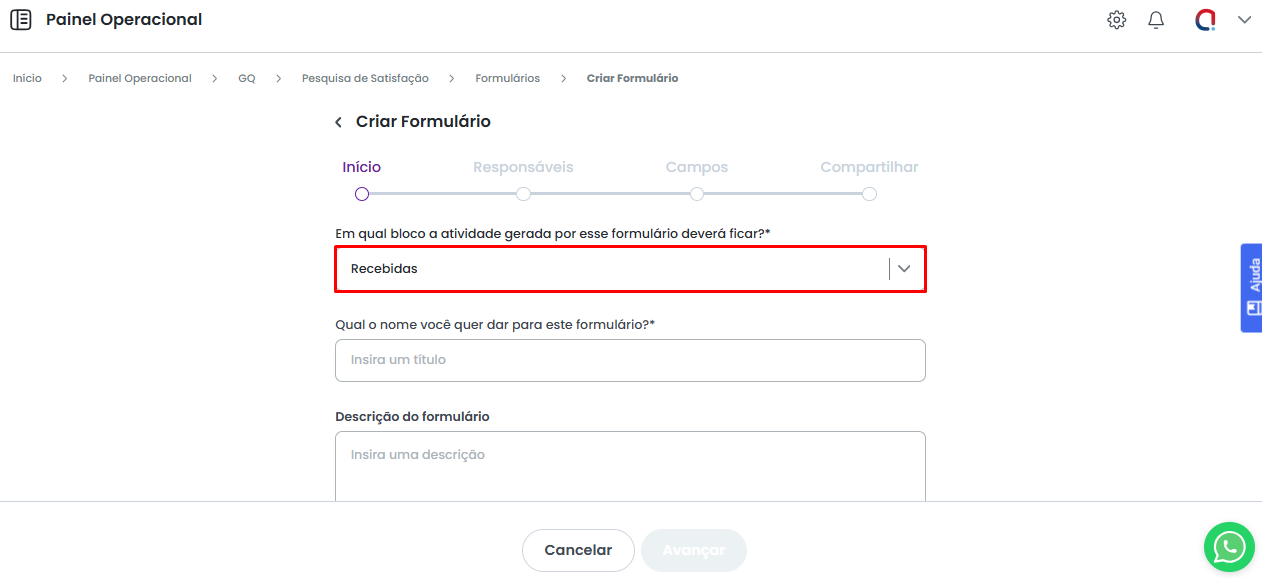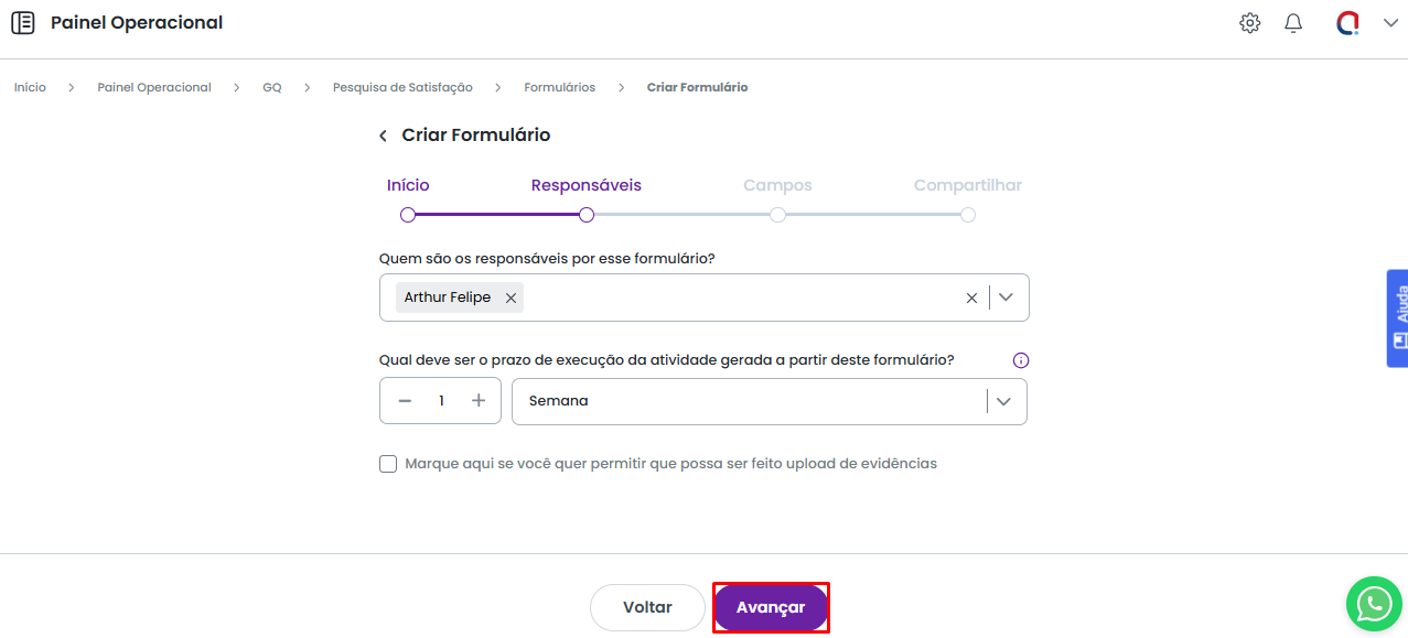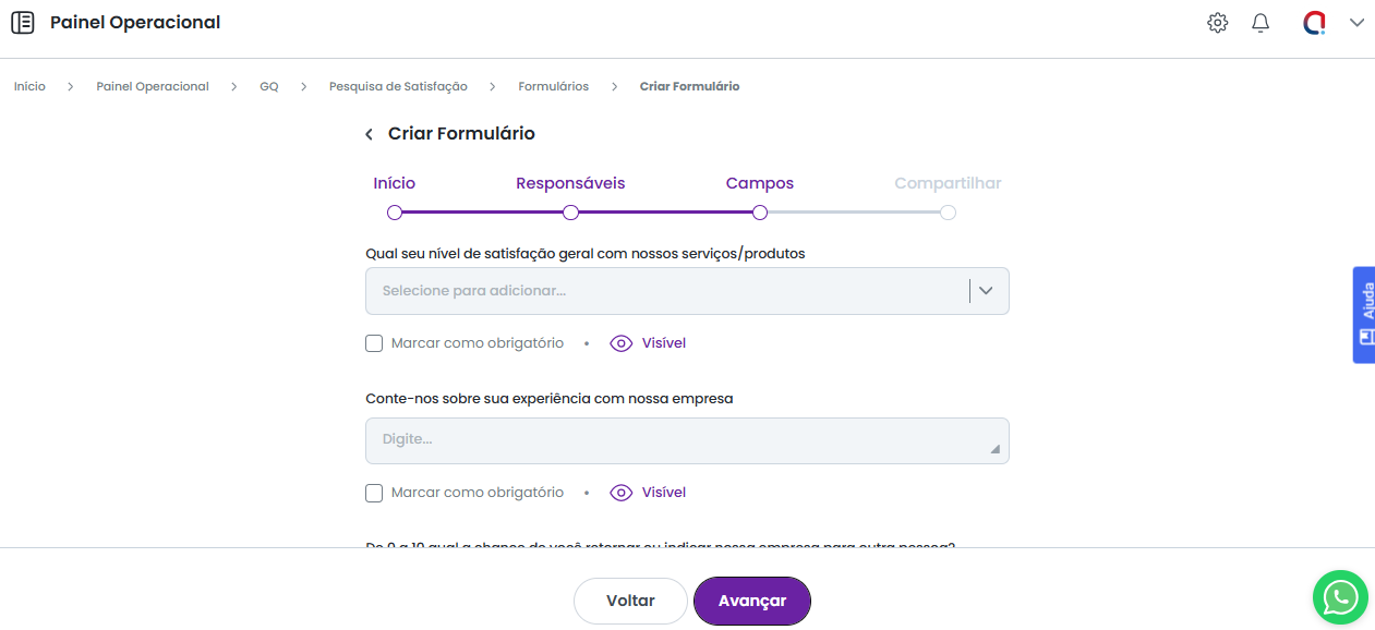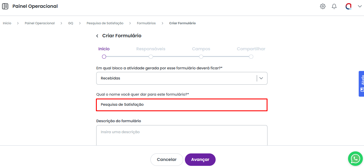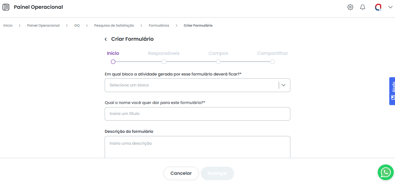 Após preencher as informações desta etapa, utilize a opção Avançar para seguir para a próxima fase da criação do formulário.