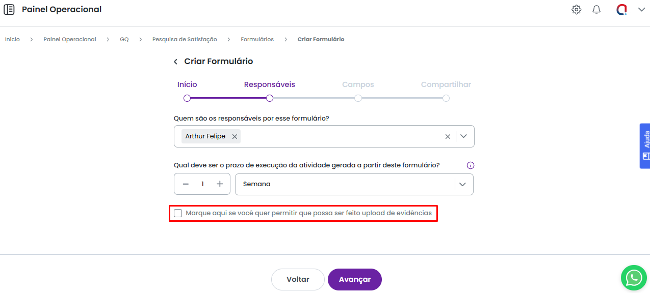 Ao final desta etapa, você tem a possibilidade de permitir que evidências sejam anexadas à atividade por meio do formulário externo.