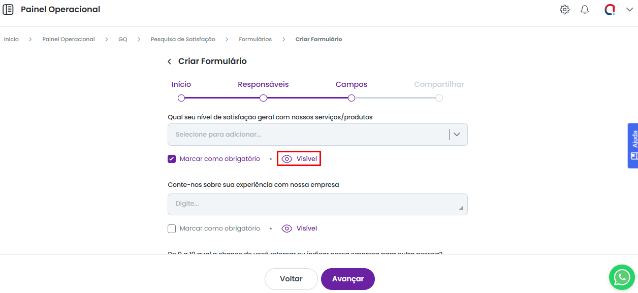 Após concluir a configuração desta etapa, utilize a opção Avançar para iniciar a fase final de criação do formulário.