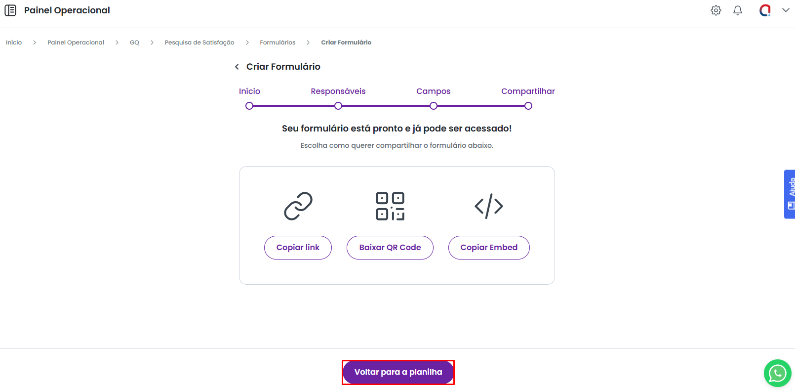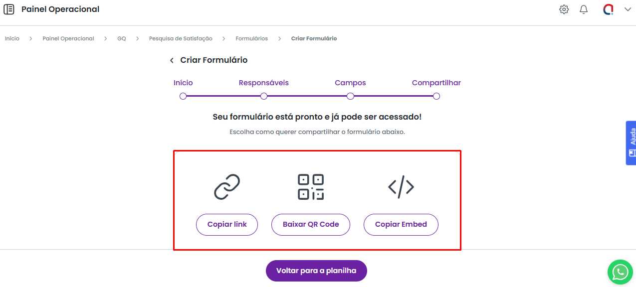 Ao finalizar o processo, seu formulário será criado. Na última etapa, você poderá: