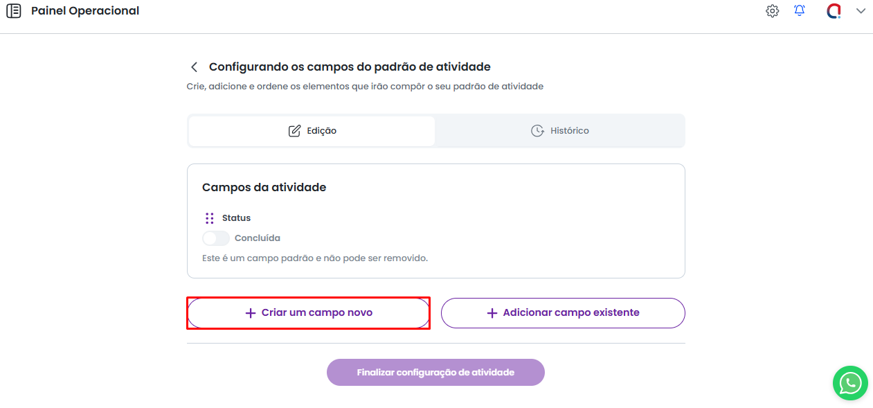 Para criar um novo campo, utilize a Criar um novo campo, presente no final da tela de Personalização do Padrão de Atividade.