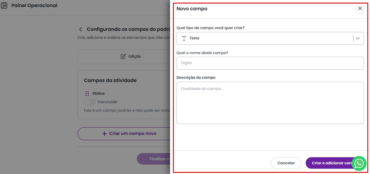 Dessa forma, será aberta um painel lateral, onde podemos realizar a criação do campo.