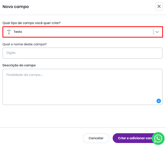 No campo Qual tipo de campo você quer criar?, selecione a categoria de campo desejada. As opções disponíveis são: Texto, Número, Seleção, Data e Pessoas. Clique aqui para conferir detalhes de cada campo.