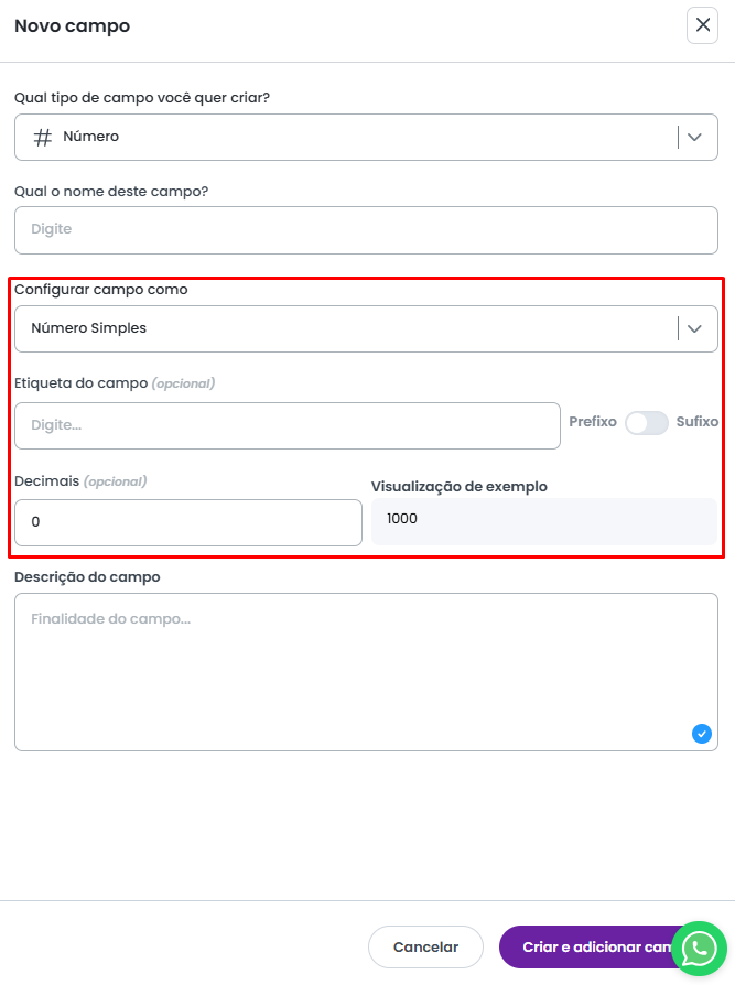 Caso o tipo de campo selecionado seja Número ou Seleção, informações adicionais de configuração serão solicitadas. Clique aqui para conferir detalhes de cada campo.
