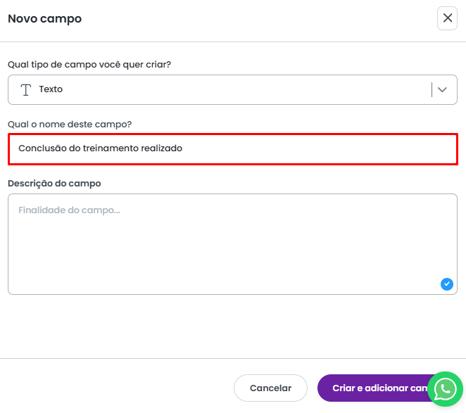 Em Qual o nome deste campo? defina o nome que o campo terá.