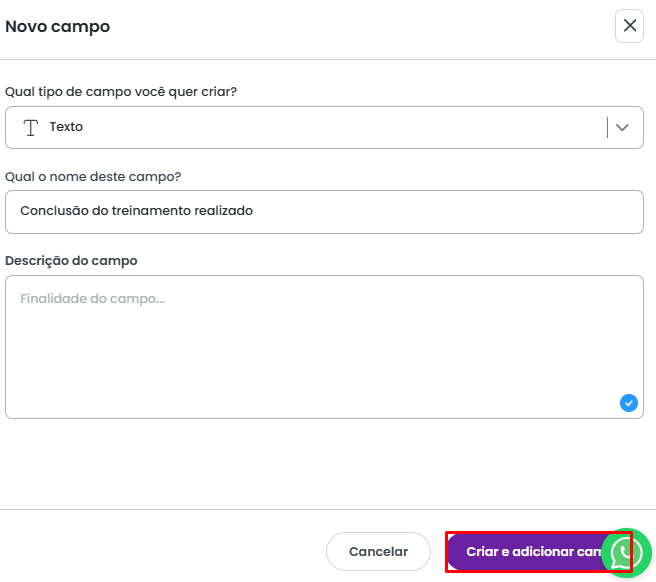 Após preencher todas as informações necessárias para o novo campo, selecione a opção Criar e adicionar campo para finalizar a criação e incluí-lo no modelo padrão de atividade.
