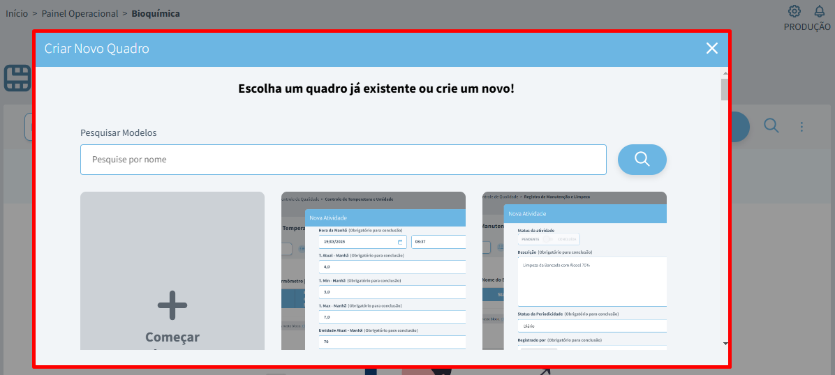 Dessa forma, será aberta uma tela com Modelos de Quadros criados pelo Acredite.se. Clique aqui para saber mais.