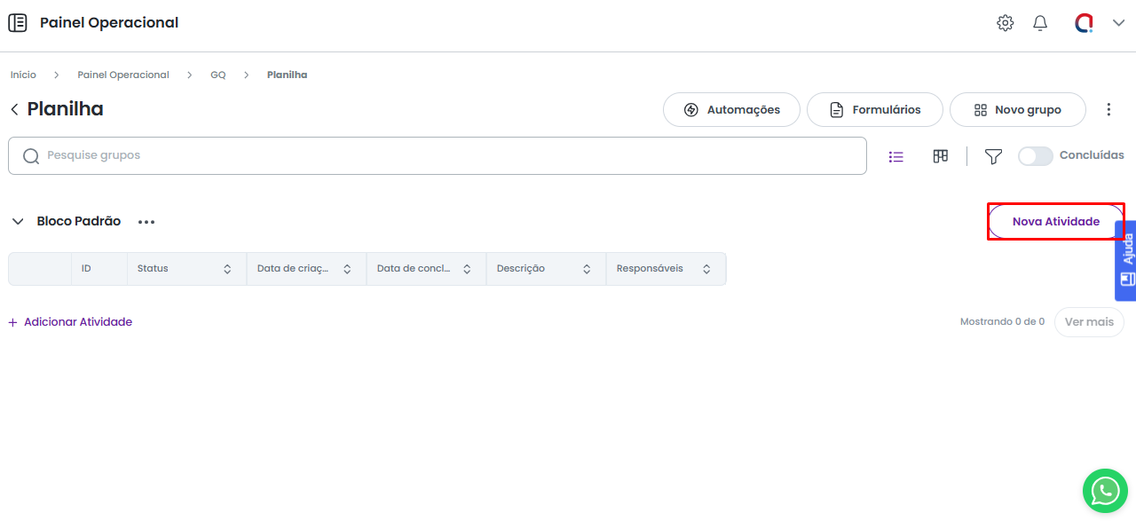 Para criar uma atividade, podemos utilizar a opção Nova Atividade.