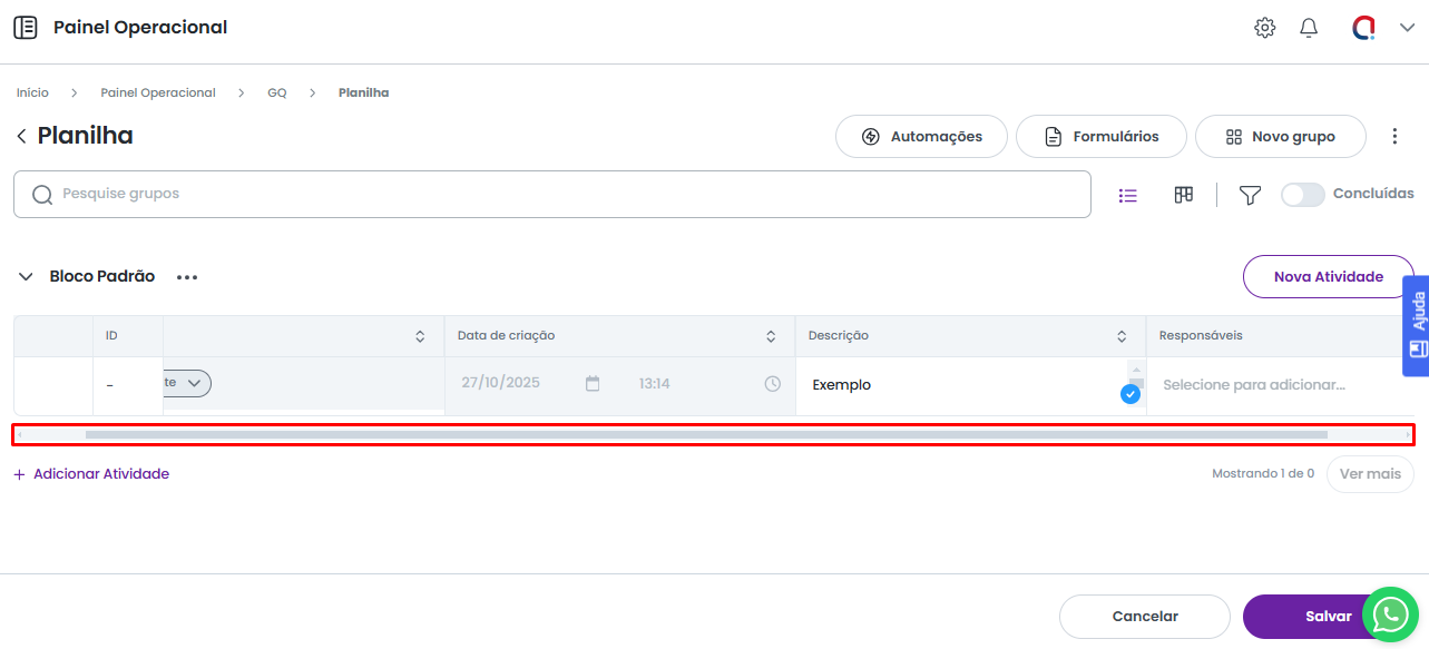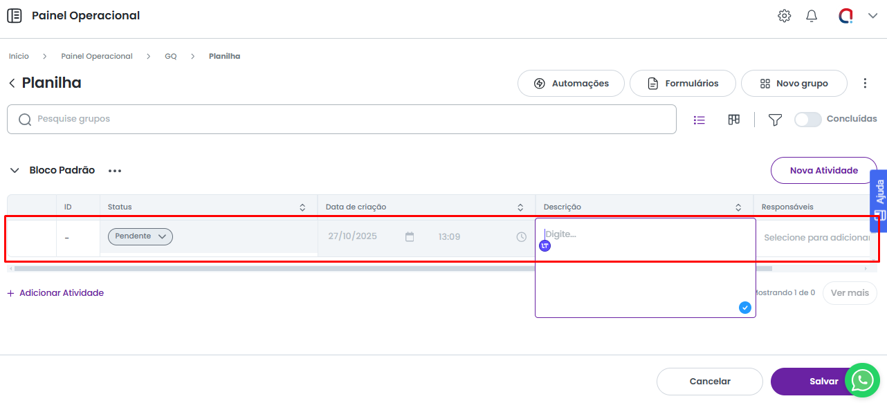 Nesta nova atividade, você pode iniciar o preenchimento dos campos visíveis na tabela imediatamente. Por padrão, o sistema abrirá o primeiro campo para edição. Para preencher qualquer outro campo, basta clicar sobre ele.