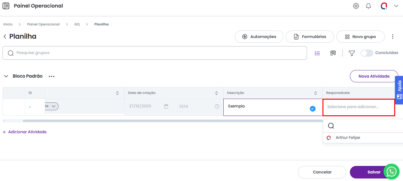 Caso precise editar um campo na atividade já criada, clique duas vezes sobre o campo desejado. O sistema permitirá a alteração da informação. Para confirmar a edição, você pode selecionar a opção Salvar ao final da tela ou pressionar a tecla Enter.