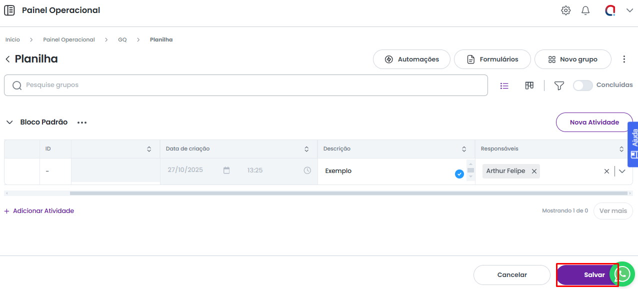 Após preencher os campos necessários, selecione a opção Salvar (localizada ao final da tela) para registrar a atividade.