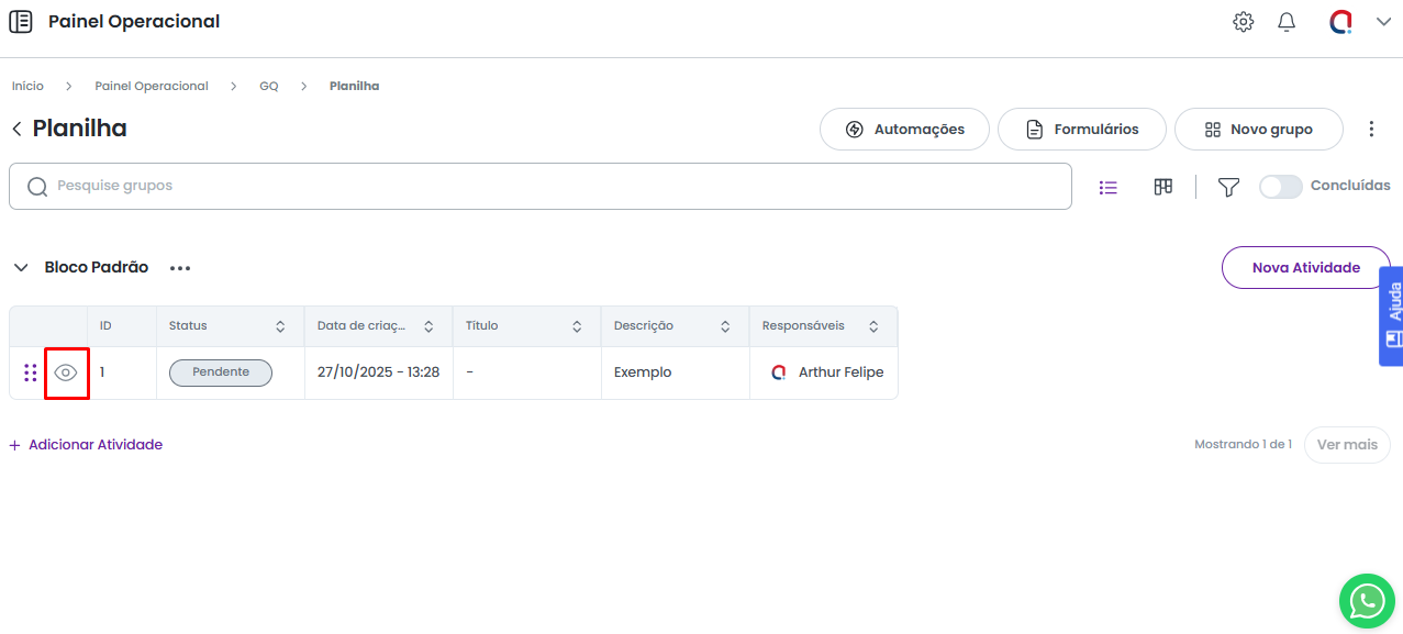 Além disso, haverá a opção Detalhes da Atividade que, ao ser selecionada, abrirá um painel lateral. Ele conterá todos os campos que a compõem, além de permitir o uso de outras funções.