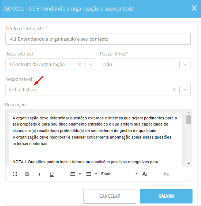 Após ser selecionada a opção, será aberta a tela para edição do requisito, podendo ser alterado o responsável. Para saber mais sobre os outros campos, clique aqui.