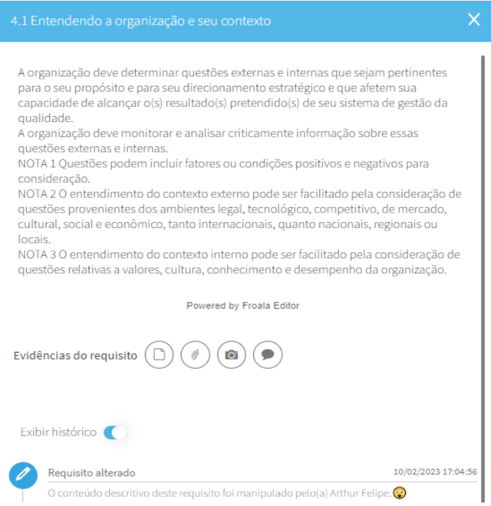 Com a opção Visualizar, o usuário terá acesso ao conteúdo, e evidências anexadas ao requisito.