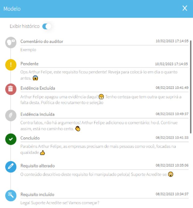 Com a opção Exibir histórico marcada, será possível visualizar alterações, ajustes, evidências adicionadas ou removidas, assim como a troca de status e os comentários realizados pelos auditores.
