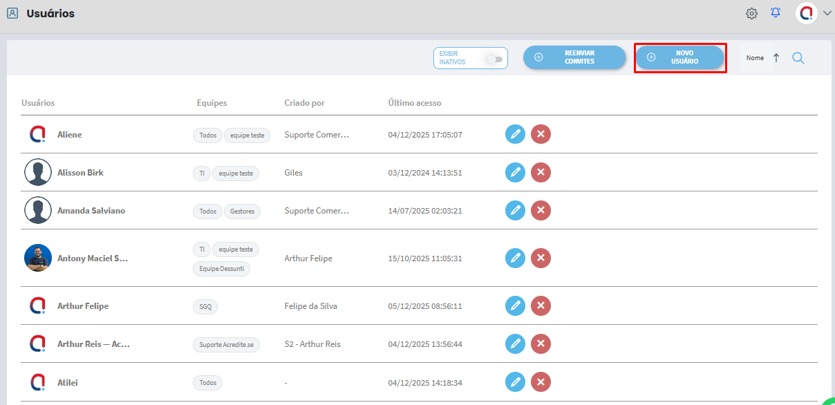 Para iniciar o processo de criação de um novo usuário no sistema, utilize a opção Novo usuário.