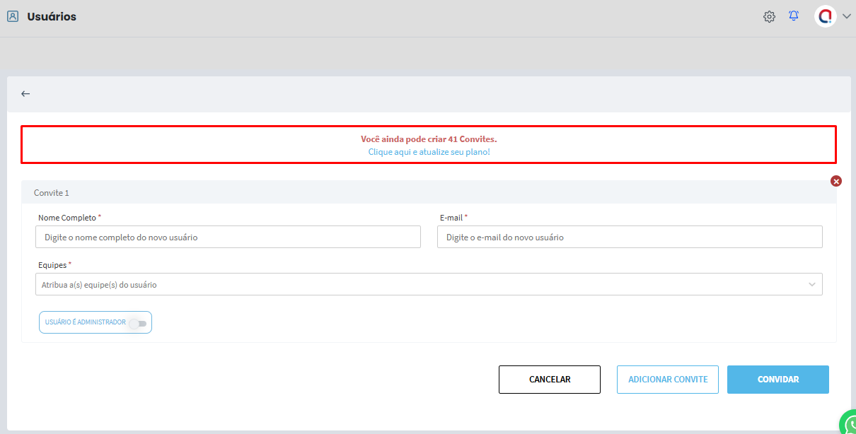Na nova tela aberta, você poderá visualizar a quantidade de convites que estão disponíveis para a criação de novos usuários.