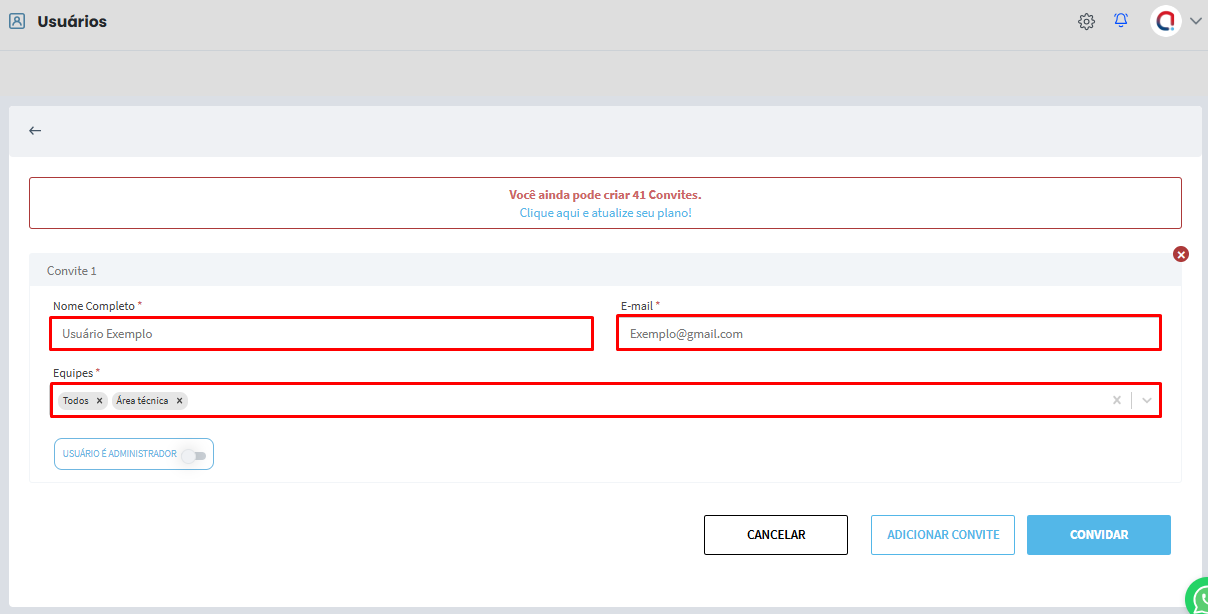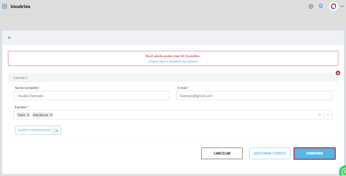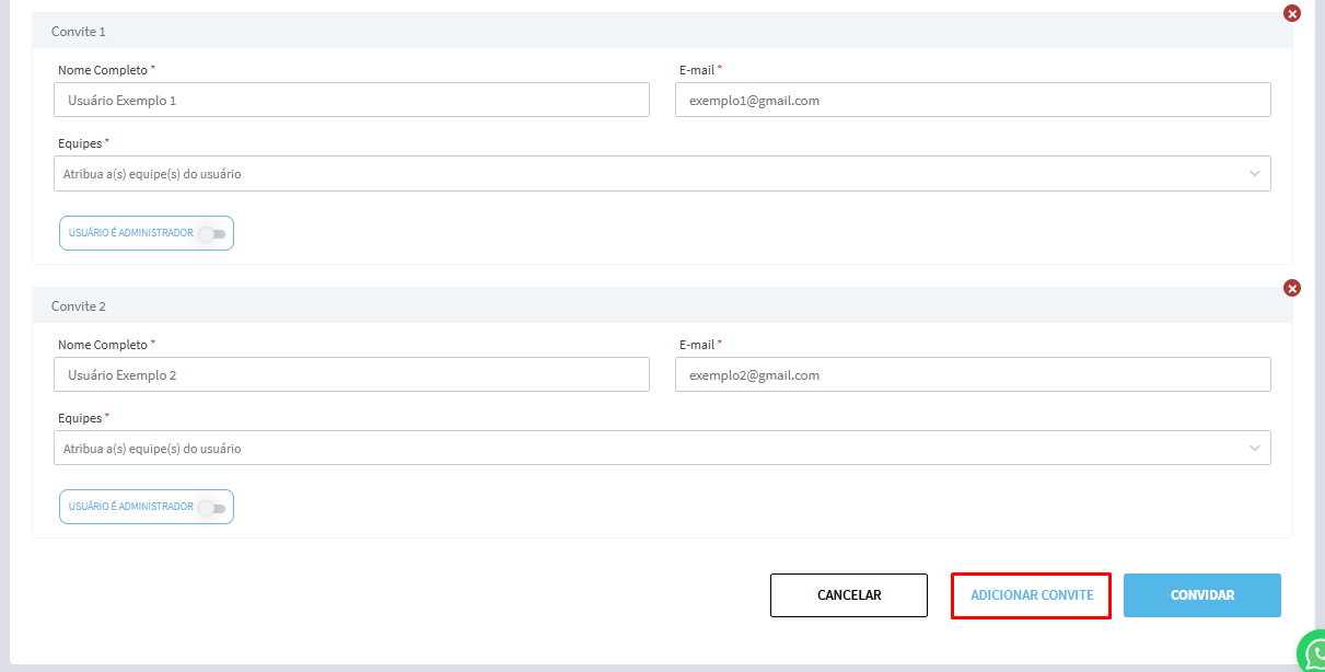 Na tela de criação de usuário, você também terá a opção Adicionar Convite, caso deseje criar mais de um usuário simultaneamente.