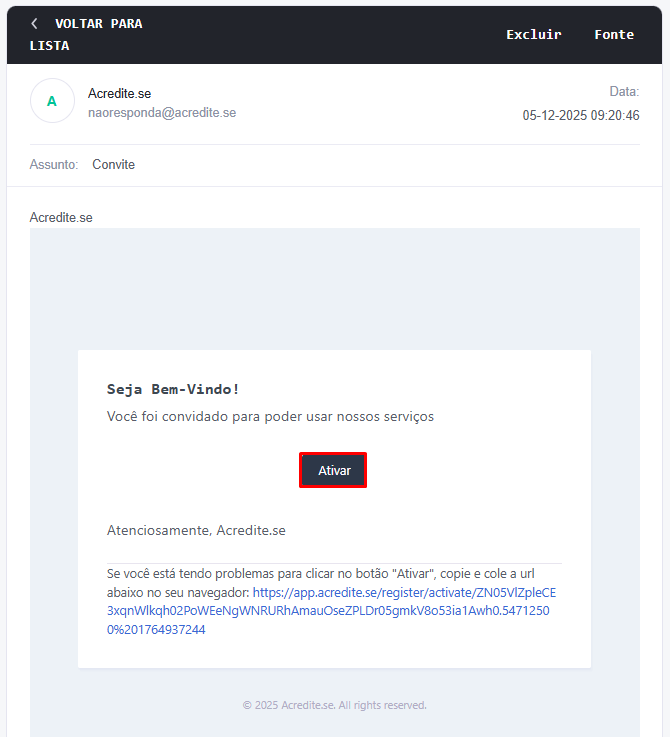 No e-mail, o usuário receberá um convite contendo um link. Este link deve ser utilizado para criar a senha de acesso. Após esse procedimento, o usuário estará criado corretamente no sistema.