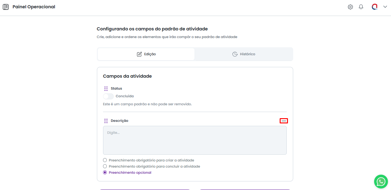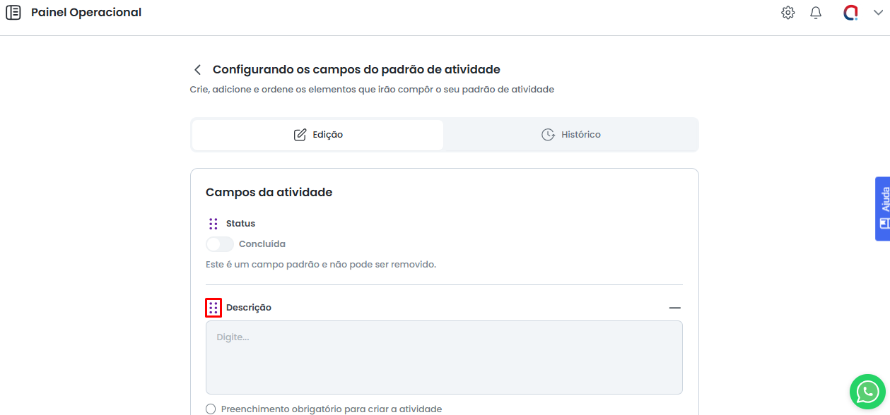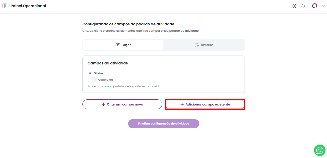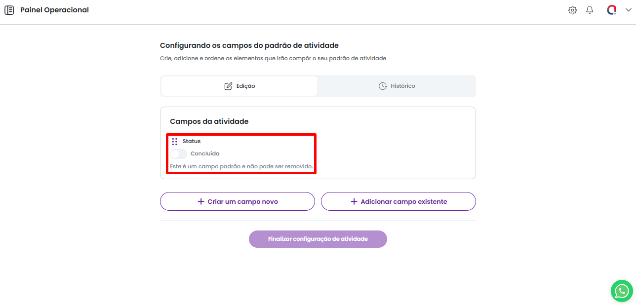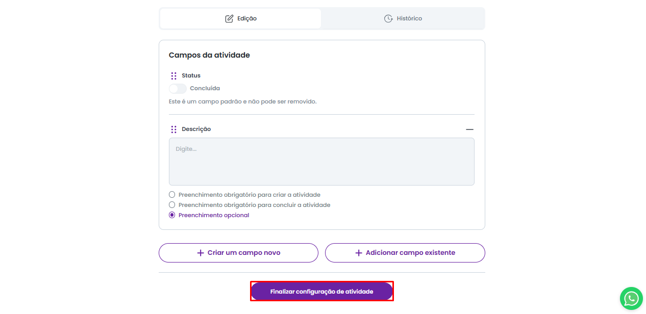 Após selecionar os campos a serem utilizados e definir a obrigatoriedade de cada um, clique em "Finalizar configuração de atividade" para aplicar o novo modelo. As alterações serão refletidas tanto nas atividades já criadas quanto nas futuras.