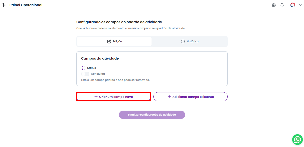 A opção Criar um Campo Novo permite que você crie um novo campo que já será incluído no modelo padrão de atividade. Clique aqui para verificar o processo de criação de campos.