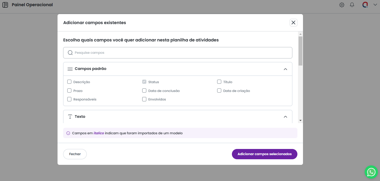 Por padrão, o campo de status já estará criado no modelo. Esse campo é obrigatório e serve para definir o status de realização da atividade, podendo ser Concluído ou Pendente.