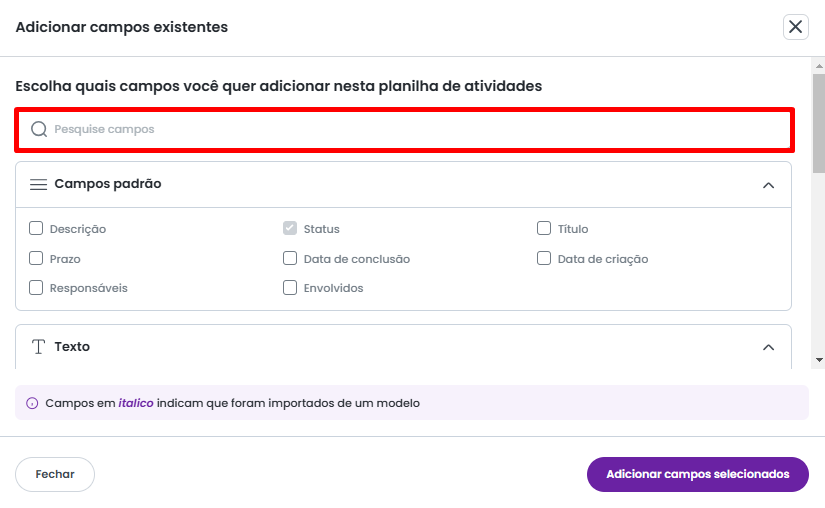 A opção Adicionar Campo Existente abrirá a tela de Gerenciamento de Campos, onde é possível selecionar campos que já estão cadastrados no sistema.