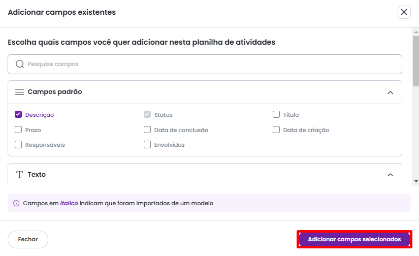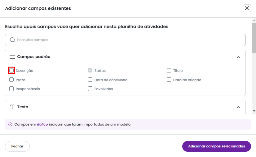 Para adicionar um campo existente ao moodelo padrão de atividade, basta marcar o checkbox referente ao campo.