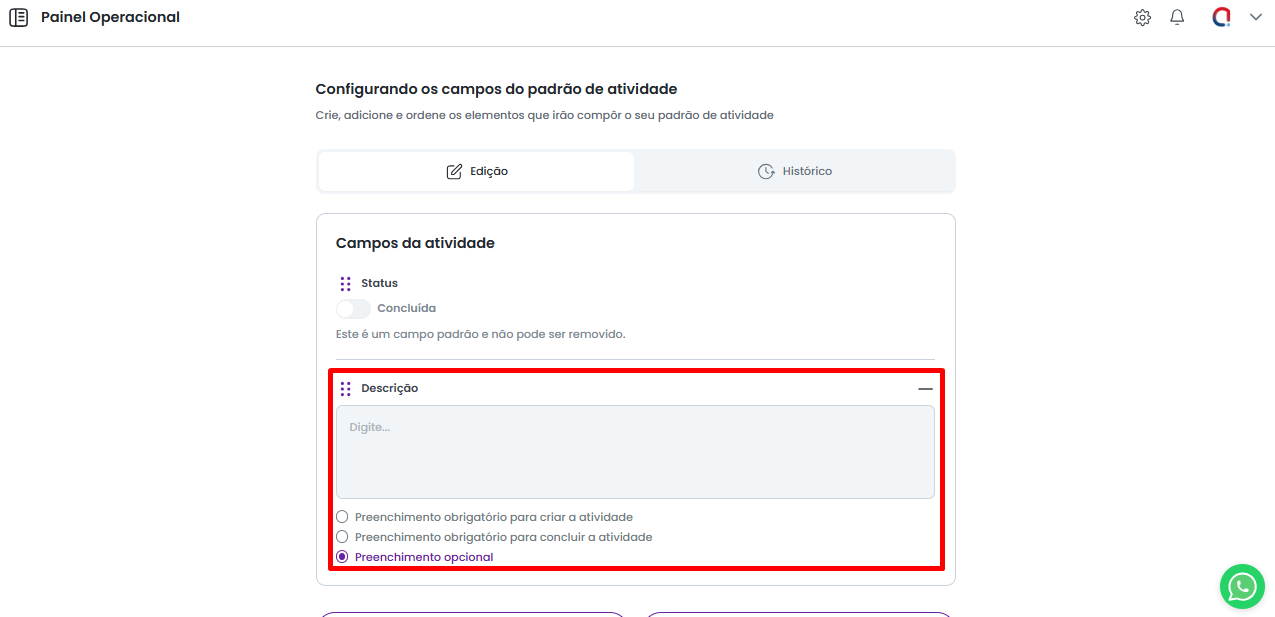 Abaixo de cada campo, estarão as opções de obrigatoriedade, que podem ser: "Preenchimento obrigatório para criar a atividade", "Preenchimento obrigatório para concluir a atividade" e "Preenchimento Opcional". Certifique-se de verificar a finalidade do campo antes de definir sua obrigatoriedade.