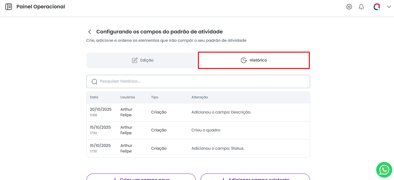 Dentro da Tela de Personalização do Padrão de Atividade, haverá a opção de Histórico, que permite consultar todas as alterações realizadas no modelo padrão de atividade ao longo do tempo.