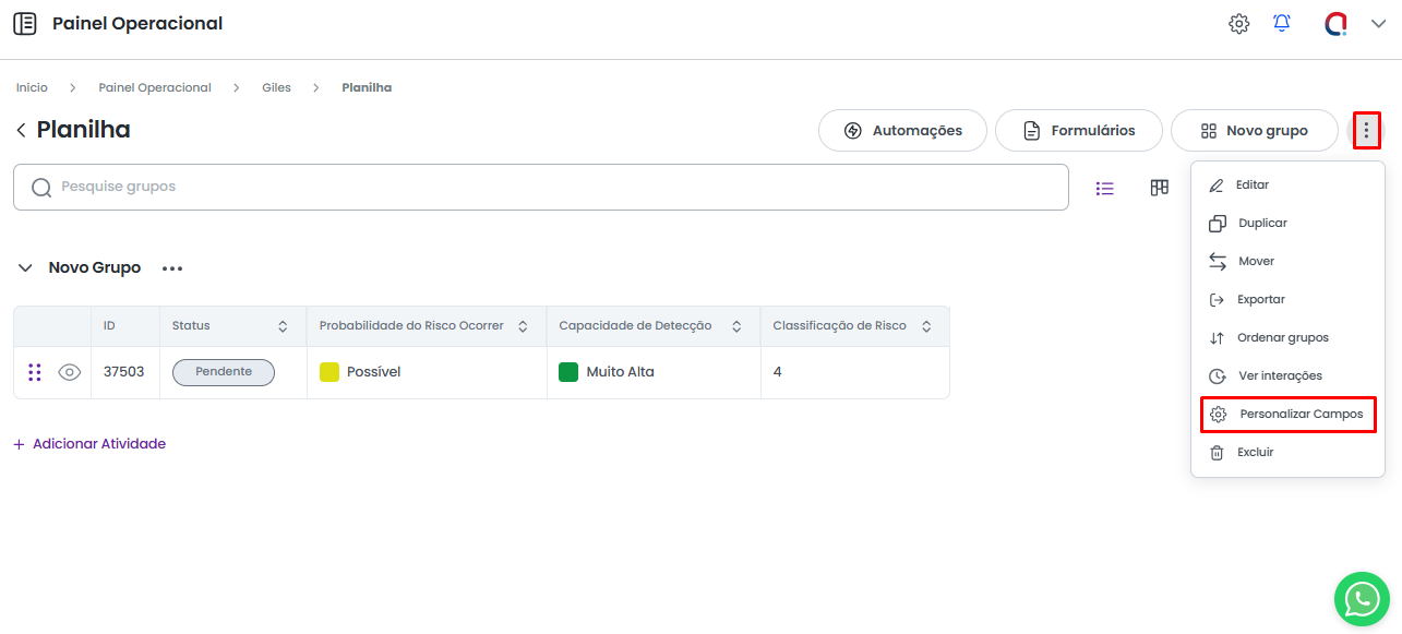 Também é possível acessar essa tela selecionando a opção Personalizar Campos, disponível no Menu de Opções da planilha.