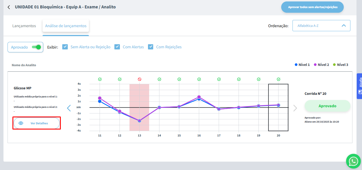Utilizando a opção Ver Detalhes, você terá acesso às informações de lançamento do analito, incluindo a Média, o Desvio Padrão (DP) e o Coeficiente de Variação (CV).