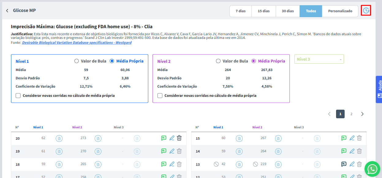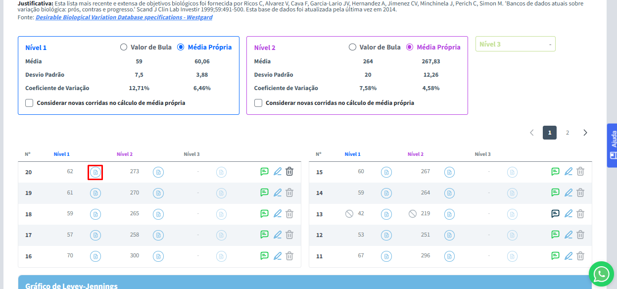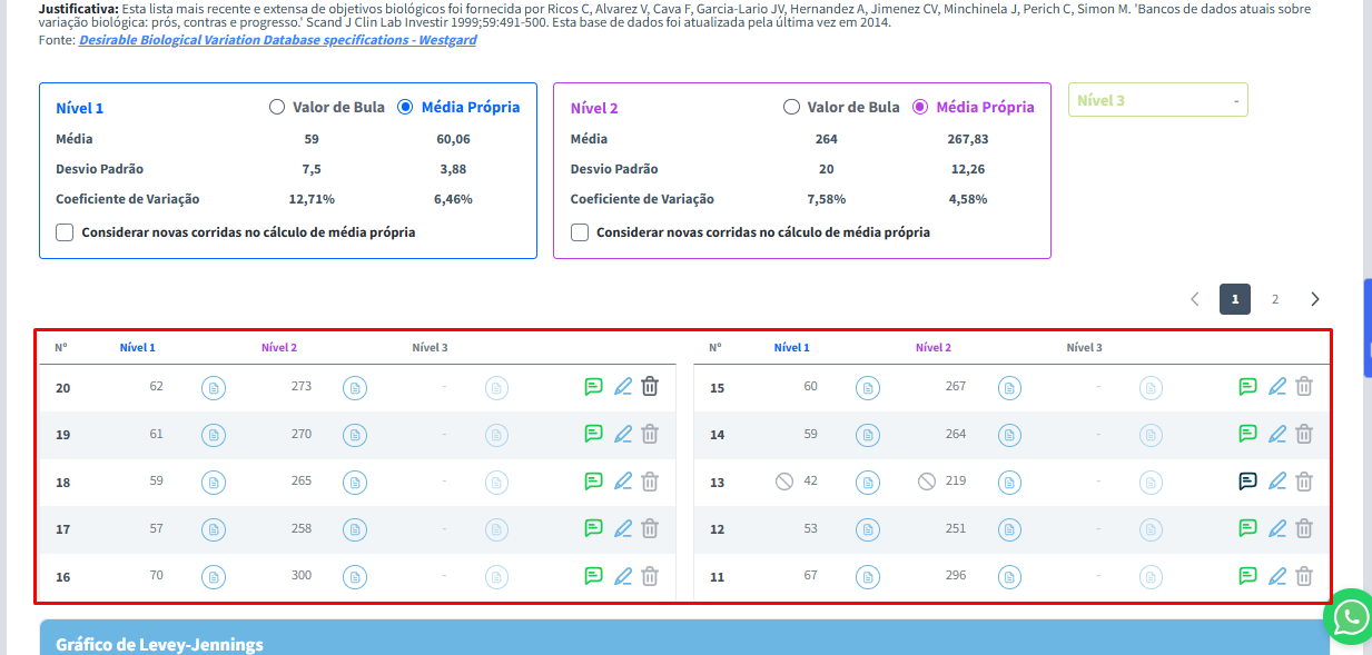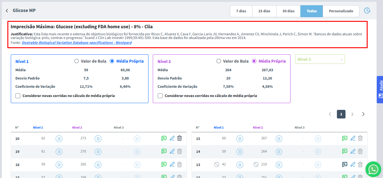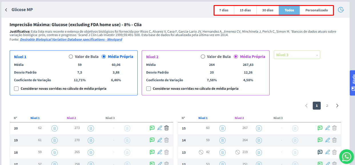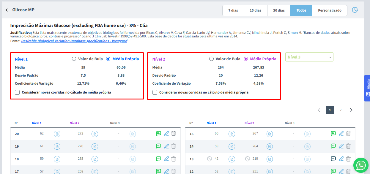 Mais abaixo, você encontrará a Média, o Desvio Padrão (DP) e o Coeficiente de Variação (CV) do analito para cada nível ativo.